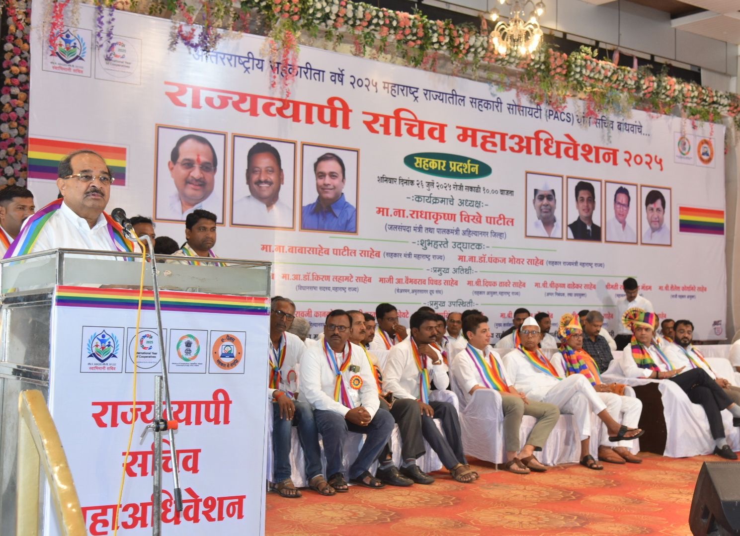 अकोले येथे स्वाभीमानी विविध कार्यकारी सहकारी सेवा सोसायट्यांच्या सचिवांच्या संघटनेचे राज्यस्तरीय अधिवशनाचे उद्घाटन मंत्री राधाकृष्ण विखे पाटील यांच्या अध्यक्षतेखाली आणि सहकार राज्यमंत्री डाॅ पंकज भोयर यांच्या उपस्थितीत संपन्न झाले.आ.डॉ किरण लहामटे आ.अमोल खताळ आ.सत्यजीत तांबे जिल्हा बँकेचे व्हा चेअरमन माधवराव कानवडे सचिव संघटनेचे अध्यक्ष गणेश रेवगडे जिल्हा उपनिंबधक मंगेश सुरवसे यांच्यासह सहकारी संस्थाचे प्रतिनिधी आणि राज्यातून आलेले सचिव उपस्थित होते.